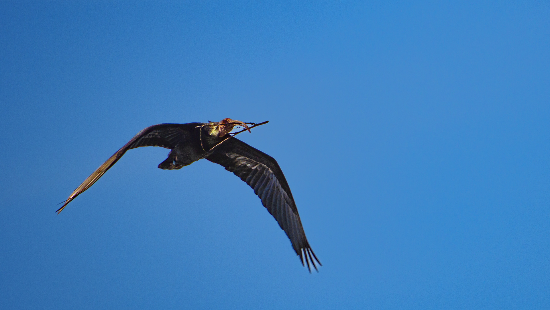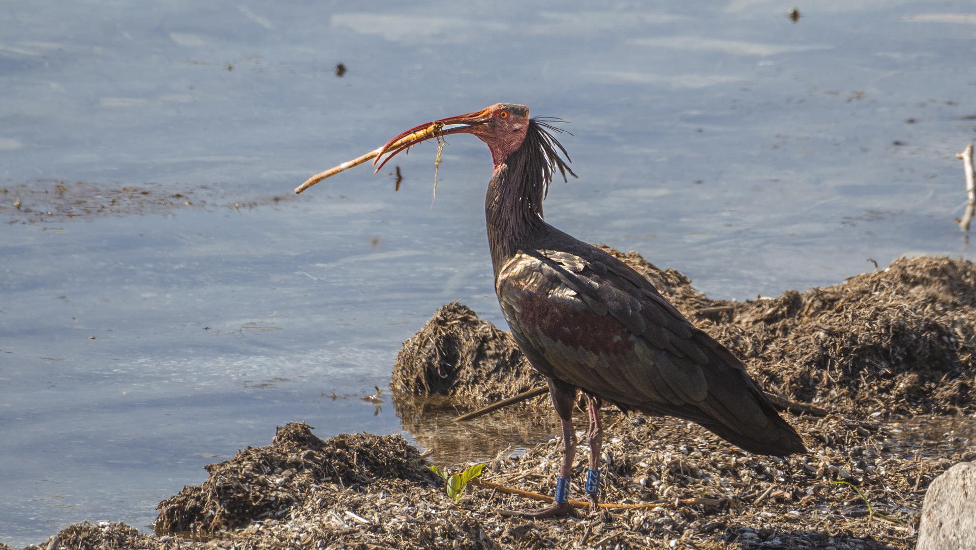 Ein Waldrapp stürzte sich immer wieder von seinem Nistplatz im Katharinenfelsen hinunter ans Bodenseeufer, nicht weit von uns entfernt. Er testete dort eine ganze Weile alle möglichen Stöckchen, Hölzchen und andere Materialen auf die Tauglichkeit, das Nest der Angebeteten zu verbessern. Ist ja vielleicht auch gut für die Beziehung. Das gab uns ausreichend Zeit uns anzupirschen, den Rest erledigt das lange Teleobjektiv, so dass sich Bernardo nicht gestört fühlen musste.