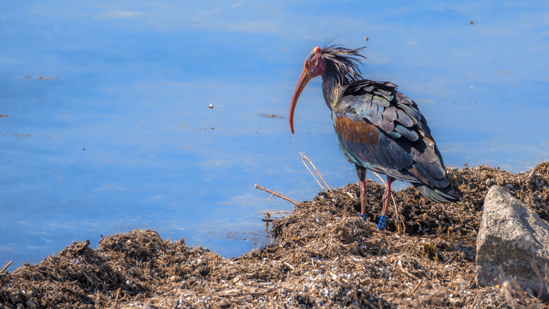 So scheint es auch Bernardo zu gehen, dem Überlinger Waldrapp mit der Nummer 225. Als ich mit meinem Fotokollegen Martin heute in der Höhe des Spetzgarter Hafens am Bodenseeufer war – eigentlich wollten wir Landzungen fotografieren, aber das Wasser im Bodensee hat sie fast alle verschluckt – fesselte etwas anderes unsere Aufmerksamkeit.
