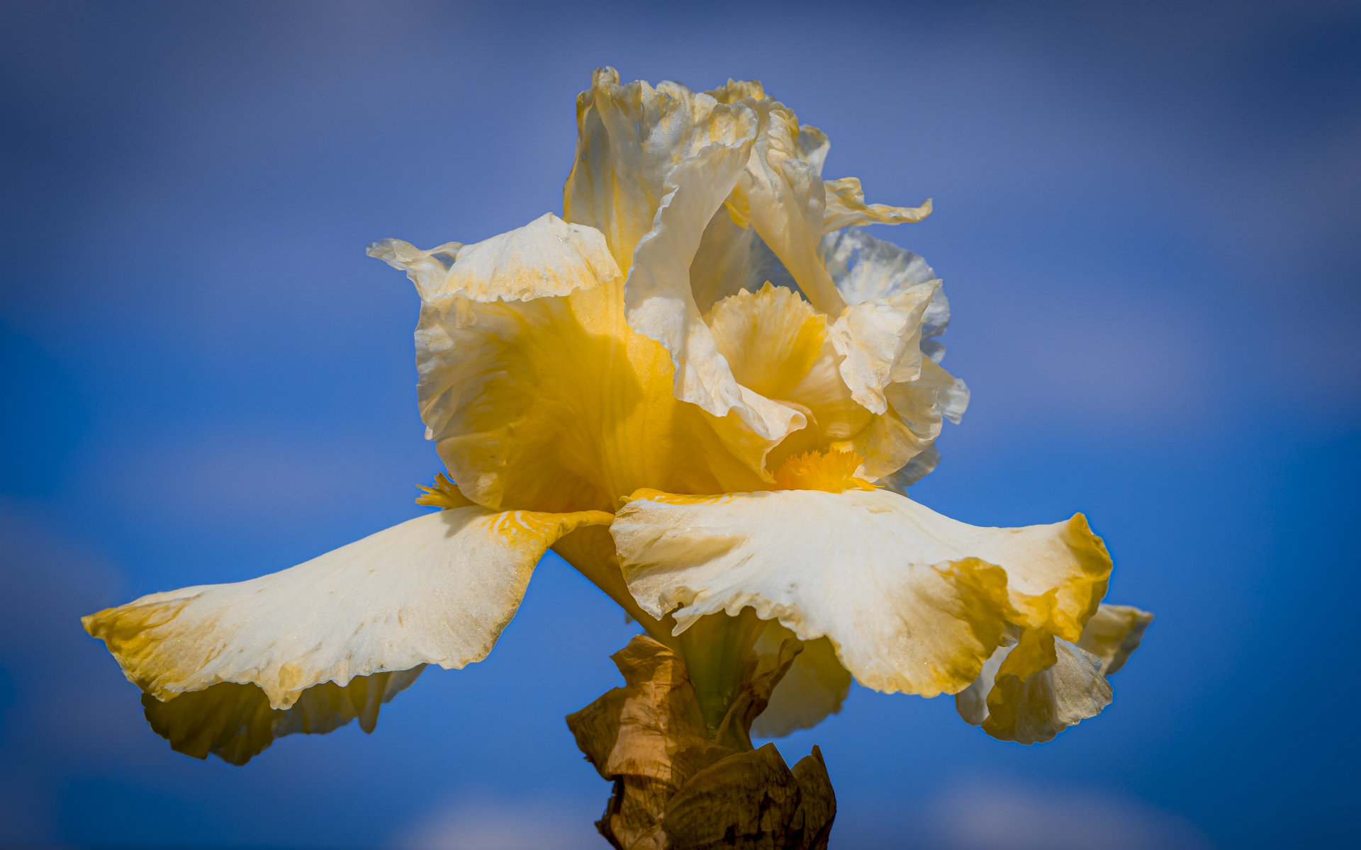 Das Problem bei der Iris ist ja auch ihre „Zerrissenheit“. Sie ist nicht so schön glatt wie eine Tulpe oder ein Gänseblümchen, daher ist eine offene Blende nicht hilfreich, wenn man Großteile der Iris scharf abbilden möchte. Wenn man sich dann noch einen tiefen Standpunkt aussucht – dem klappbaren Display sei Dank – wachsen die Iris geradewegs bis in den Himmel. Die Farbvielfalt ist auf jeden fall außergewöhnlich.