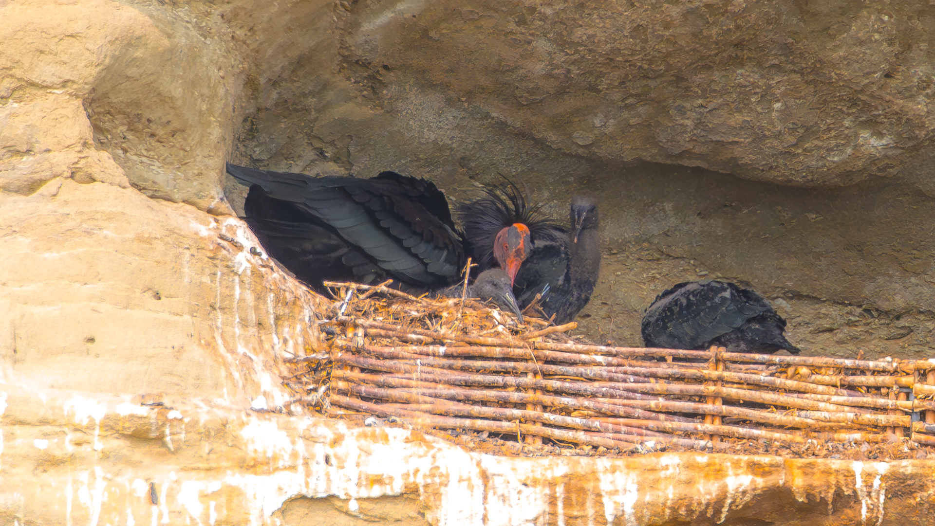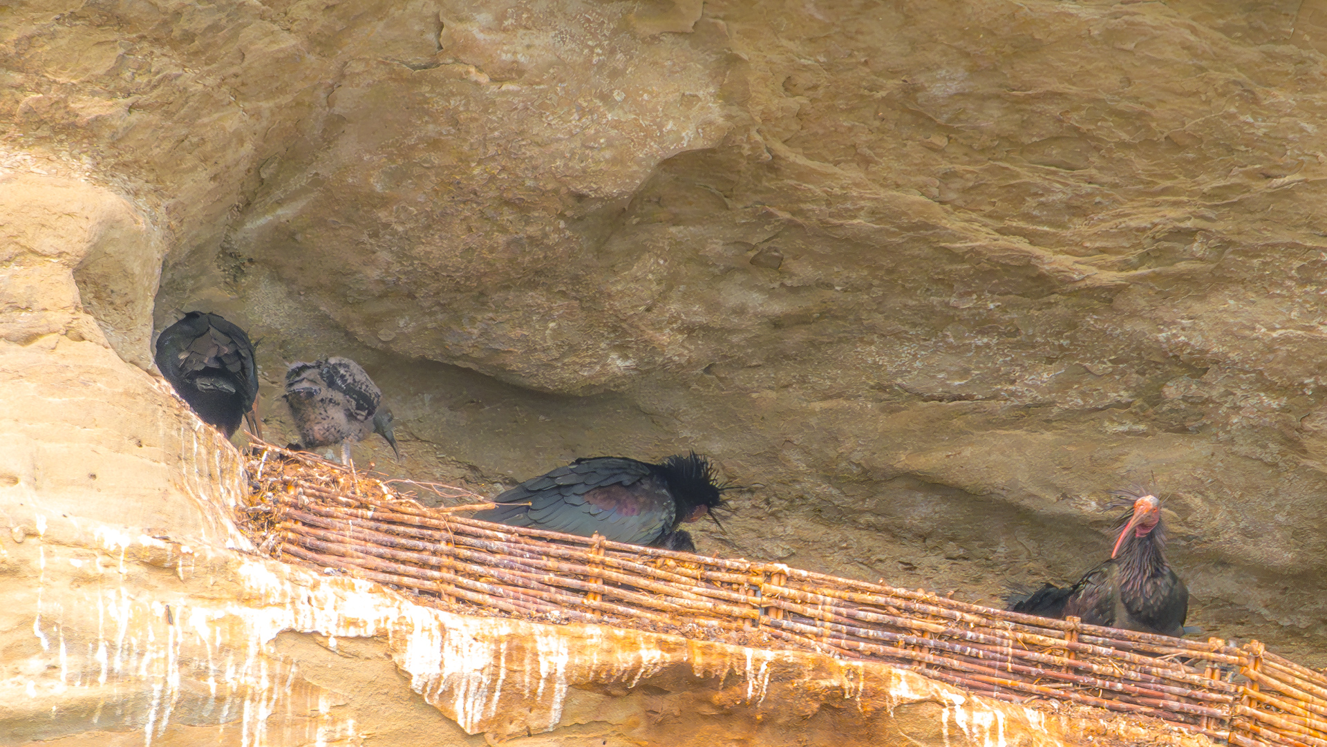 Auch wenn die Elterntiere sich schützend vor den Nachwuchs stellen, tauchen sie immer mal wieder auf, manchmal sogar gleich mehrere zusammen. Wieviel es insgesamt sind, ist noch unklar. Das Waldrappteam schätzt – auf Grund der mangelnden Zahl der Weibchen dieses Jahr – den Nachwuchs auf maximal 8-10 Exemplare. Endgültig werden wir das erst Ende Sommer sehen, wenn sie die Nistspalte verlassen.