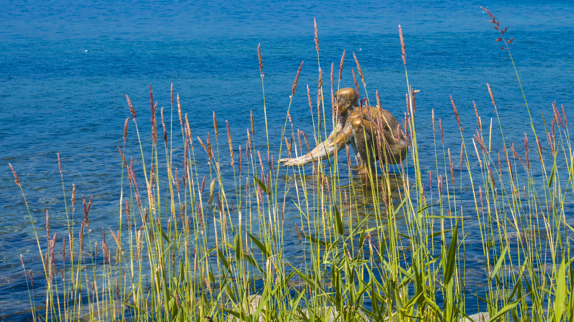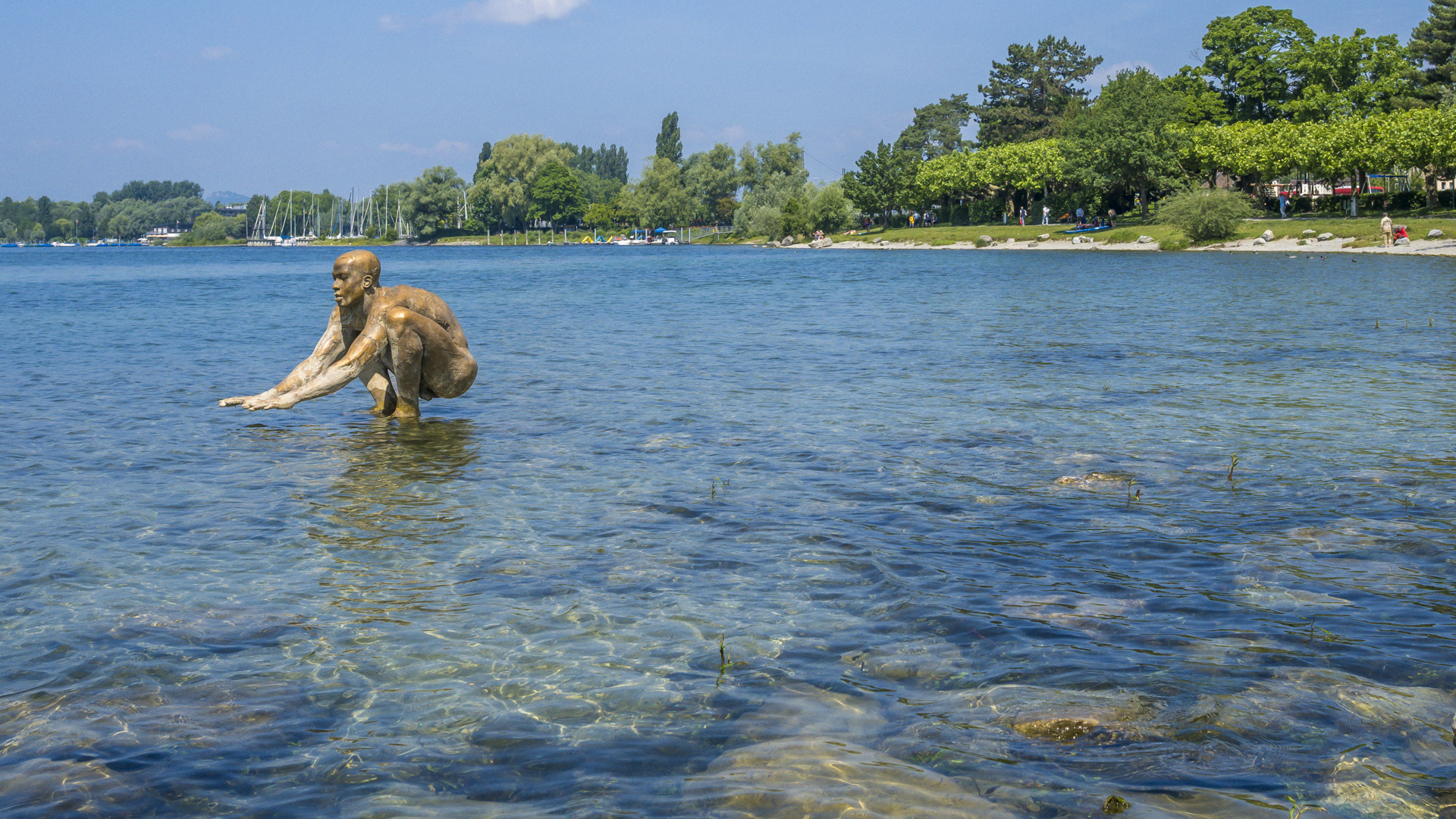 El Niño wird von vielen Einheimischen und Besuchern auch zur Messung des Wasserspiegels genutzt, denn je nach Wasserstand, sieht man mal mehr und mal weniger von der Statue. Als wir auf unserer 1. Mai Radtour das erste Mal dort waren, hatte der Bodensee historisches Niedrigwasser und die Figur stand auf dem Trockenen. Ich konnte problemlos hinlaufen und aus der Nähe fotografieren. Bei unserem nächsten Besuch, ein paar Wochen später, hätte ich mir dabei nasse Füße geholt. Der Bodensee hatte kräftige 80 cm zugelegt, das sind umgerechnt rund 43 Milliarden Liter Bodenseewasser.