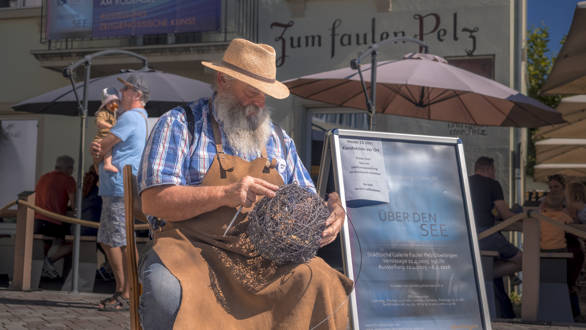 Mein Fotomodell heute war der Schweizer Künstler Walter Zepf, der in der Tat ein wenig wie der Alm-Öhi von Heidi aussieht. Er stellt in der aktuellen Ausstellung im Faulen Pelz aus und hatte sich heute bereiterklärt live vor Publikum seine „Eisenbälle“ zu konstruieren.