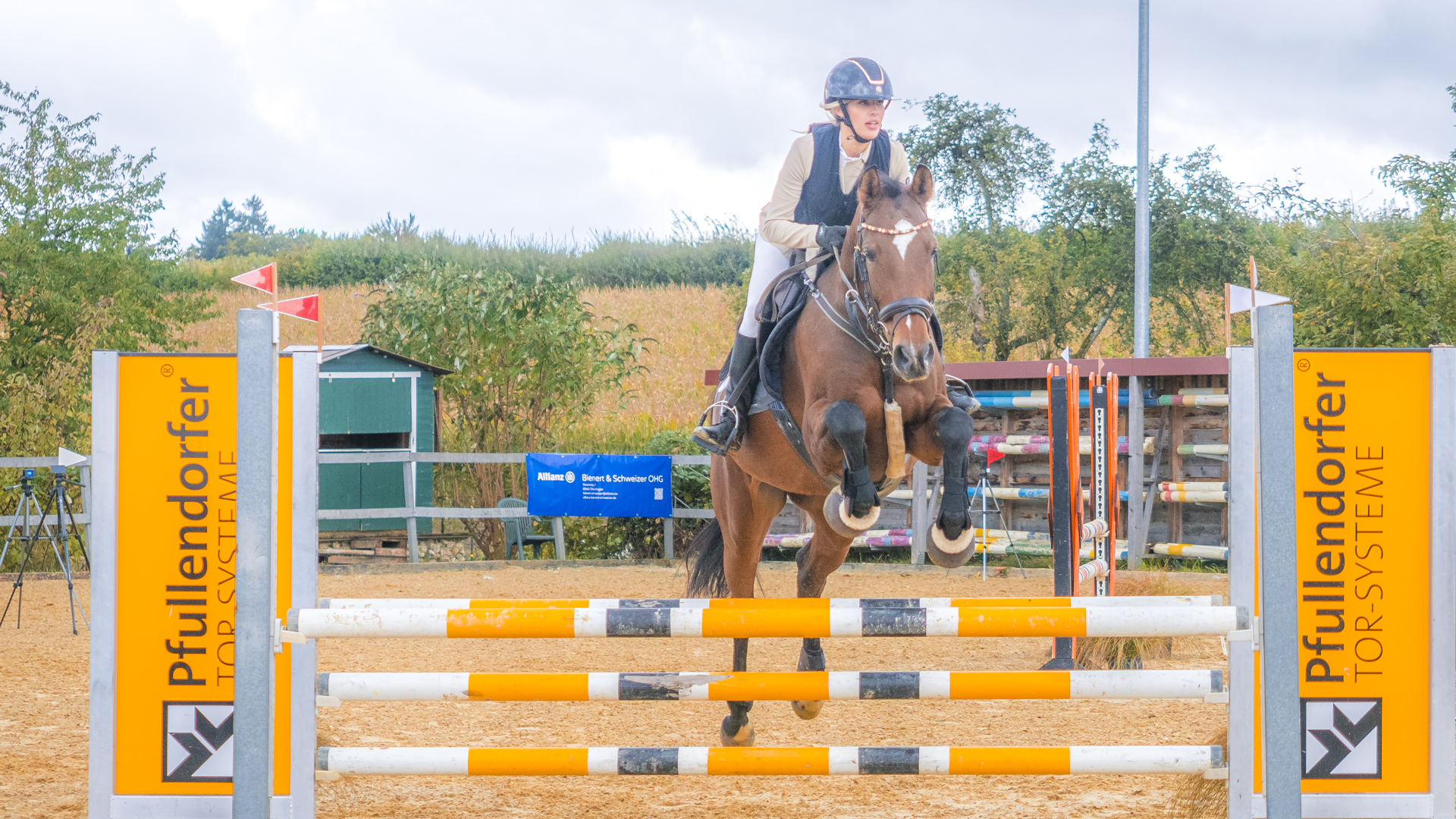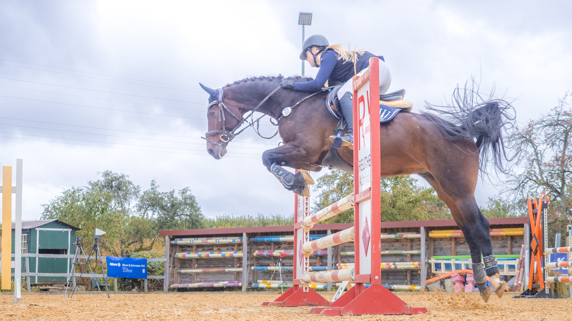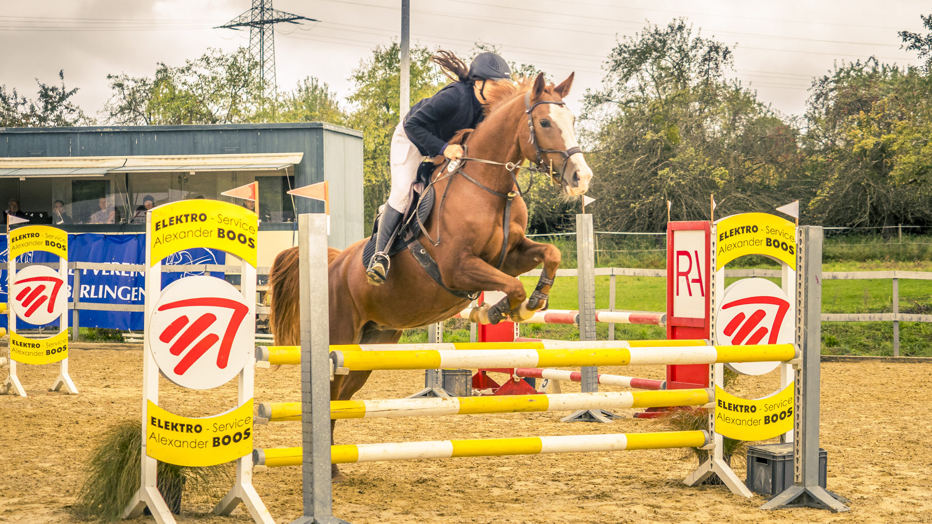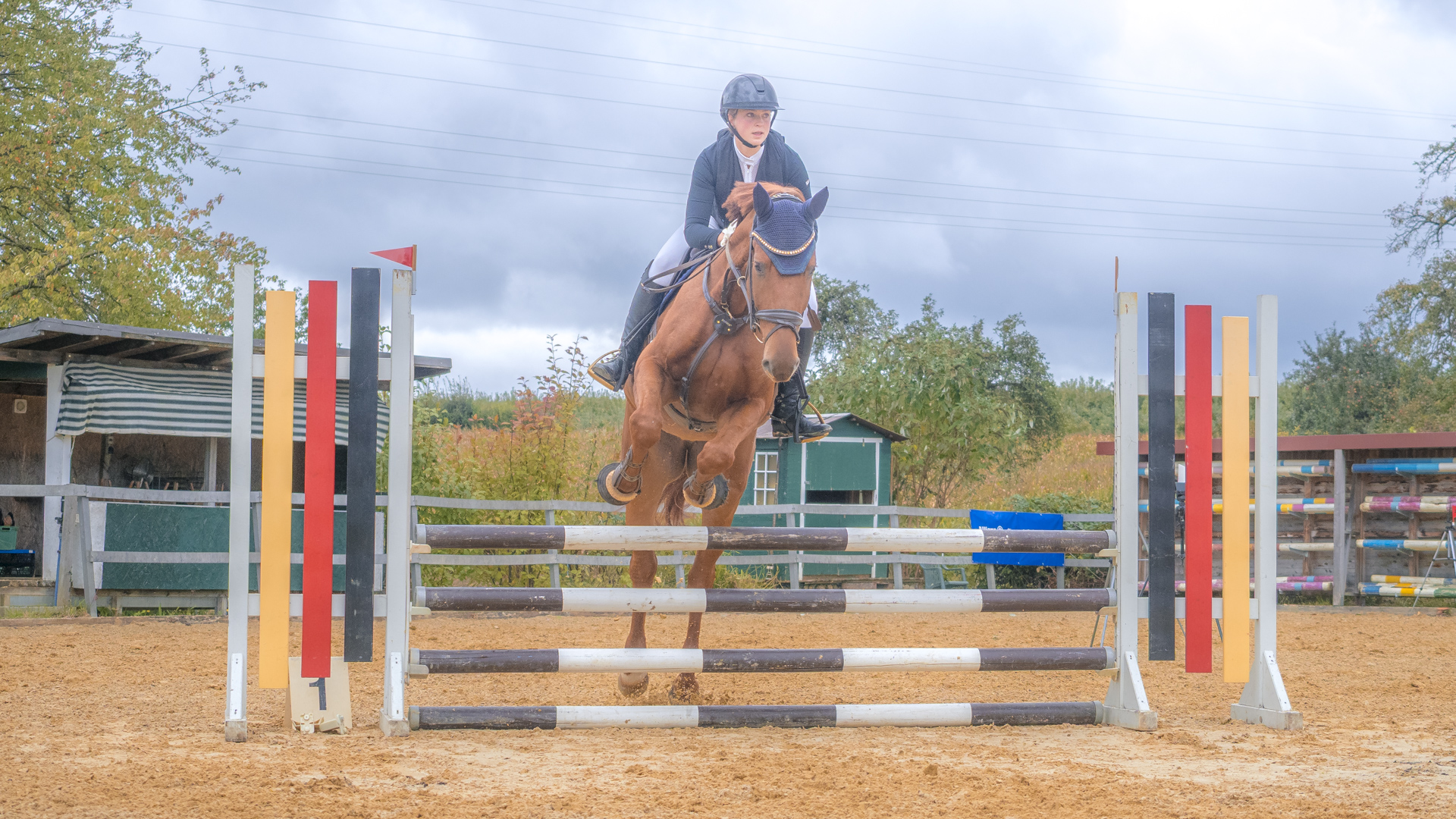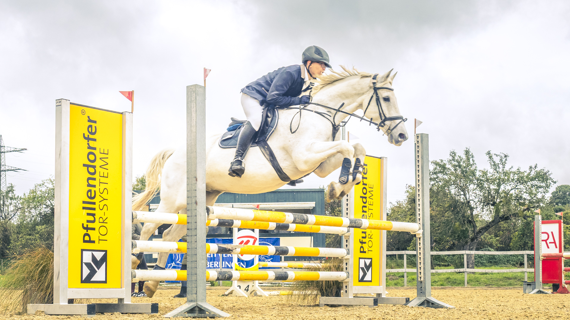 Da es mein erstes Reitturnier als Fotograf war, habe ich mich natürlich vorher informiert, was zum Einen der beste Standpunkt und zum Anderen die beste Kameraeinstellung ist. Ein rotes und ein weißes Fähnchen auf dem Oxer legen fest, wie das Hindernis übersprungen wird. Das rote Fähnchen befindet sich beim Sprung an der rechten Schulter der ReiterInnen. Wenn ich als Fotograf es links habe, sehe ich den Sprung von vorne. Passt.