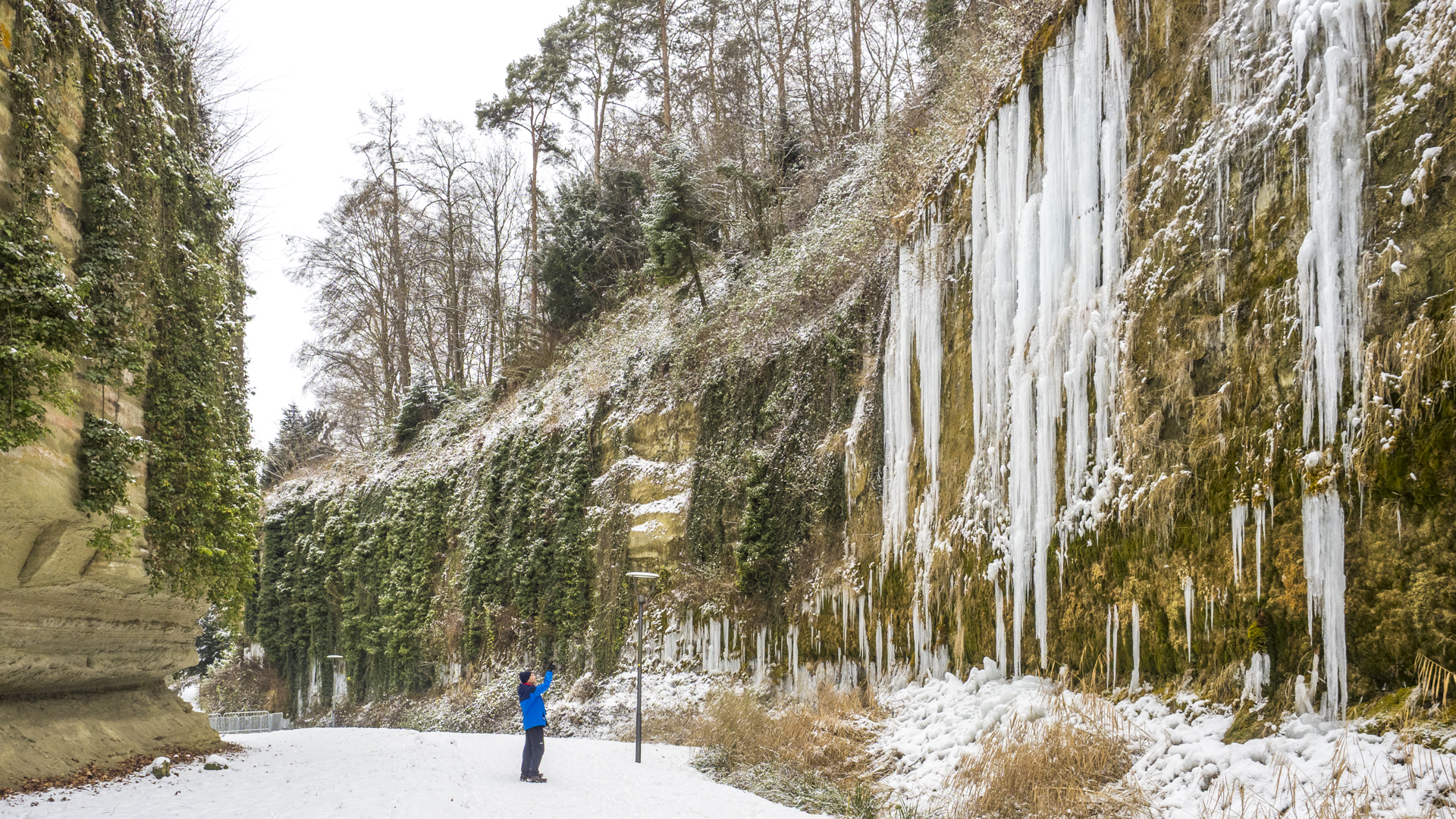 Wie vergänglich manche Dinge sind, zeigte sich in Überlingen im Stadtgraben. Ich hatte gestern noch, bei rund – 3° die Gelegenheit genutzt die riesigen Eisgebilde zu fotografieren, die sich dort an der Wand gebildet hatten. An dieser Wand läuft permanent Wasser herunter – was den Graben im Sommer herrlich runterkühlt – und bildet natürlich bei den aktuellen Minusgraden formidable Eisstrukturen.