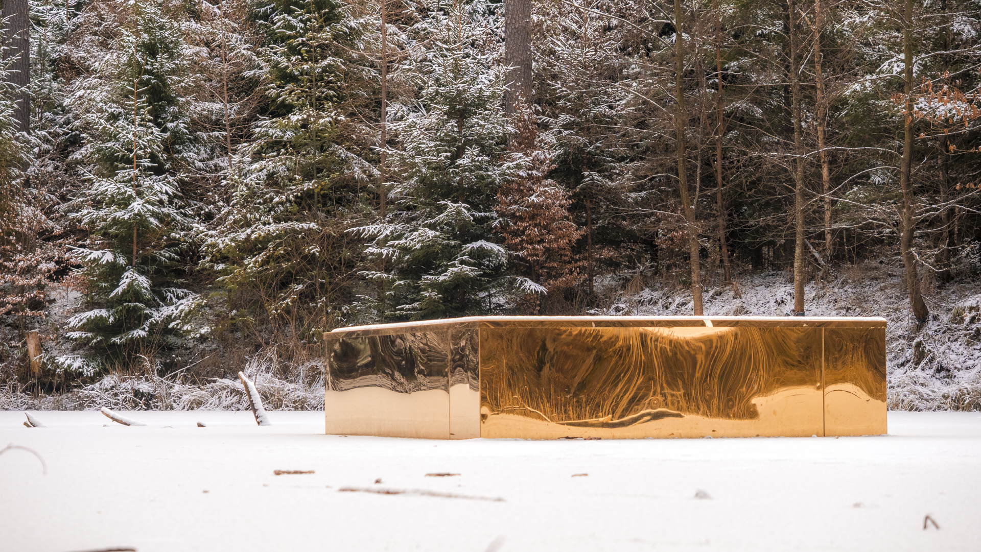 Zum Schluss noch ein Foto des großen Kubus in dem der Wald selbst als Portrait erscheint. Sozusagen der Wald im Spiegel des winterlichen Waldes.