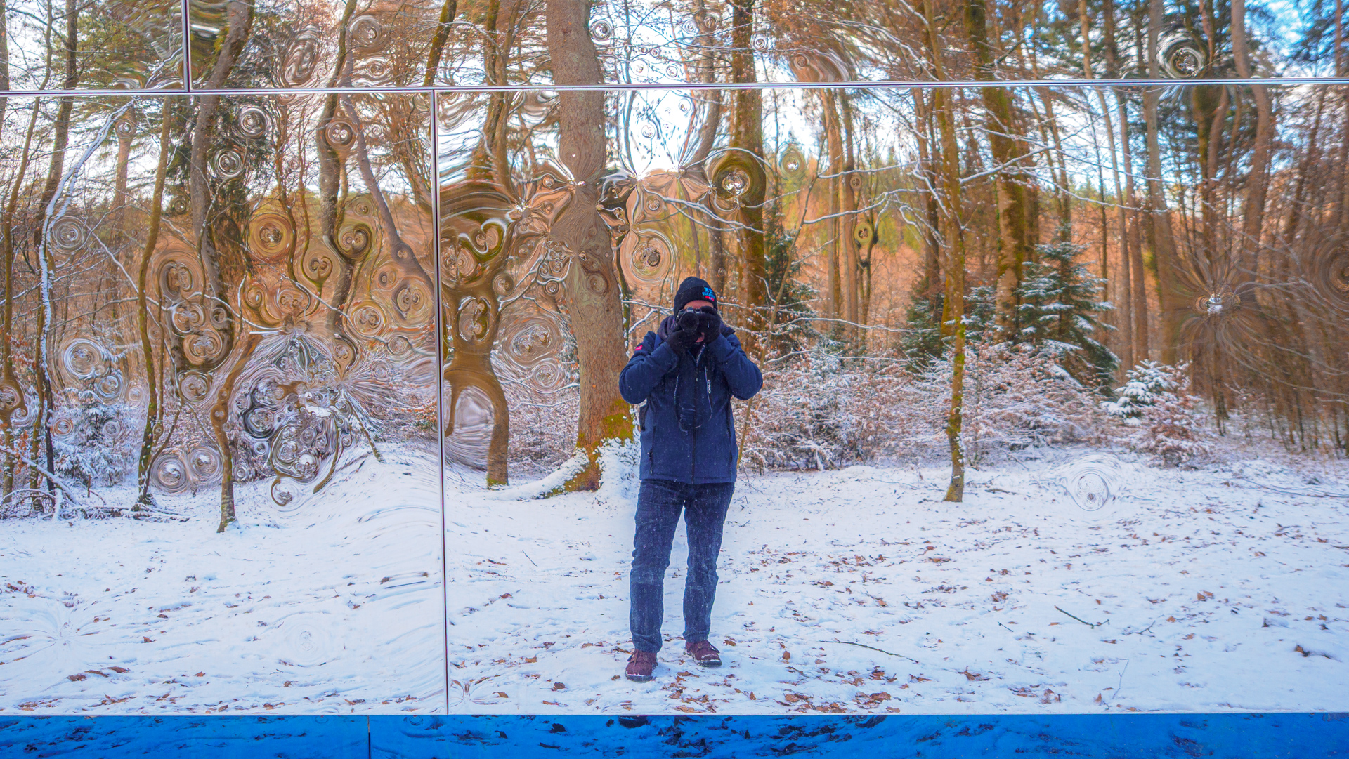 Der letzte Punkt führt mich natürlich zur Station „Selbstportrait“. Der große Spiegelkubus mitten m Wald zeigt sich winterlich kühl, wie im Titel des Beitrags zu sehen ist. Um seinem Namen gerecht zu werden, musste ich mich natürlich auch selbst portraitieren. Ich fotografiere, also bin ich.