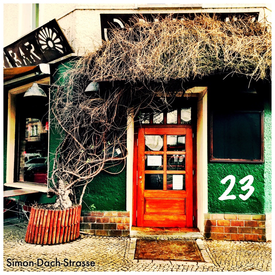 Wenn man im Conmux in der Simon-Dach-Strasse im Sommer draussen unter der Hecke sitzt, die sich von der Eingangstür die Fassade entlang windet, versteht man sein eigenes Wort nicht mehr. Aus der Geräuschkulisse schließend, müssten dort hunderte Spatzen ihr zu Hause haben. Man sieht sie aber nicht wirklich. Ab und an fliegen Einzelne raus oder rein, aber wenn alle wegfliegen, müsste eine Spatzenwolke entstehen. Jetzt ist allerdings Stille eingekehrt, sind wohl alle im verdienten Winterurlaub.
