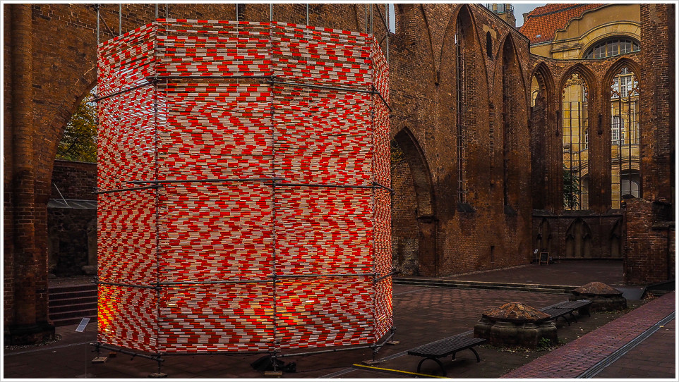 Was hier aussieht wie größere Installationsarbeiten in der Ruine der Klosterkirche, handelt sich in Wirklichkeit um eine Rauminstallation von Luc Wolff. In der Pressemappe zur Ausstellung findet sich der folgende Text über den Künstler: