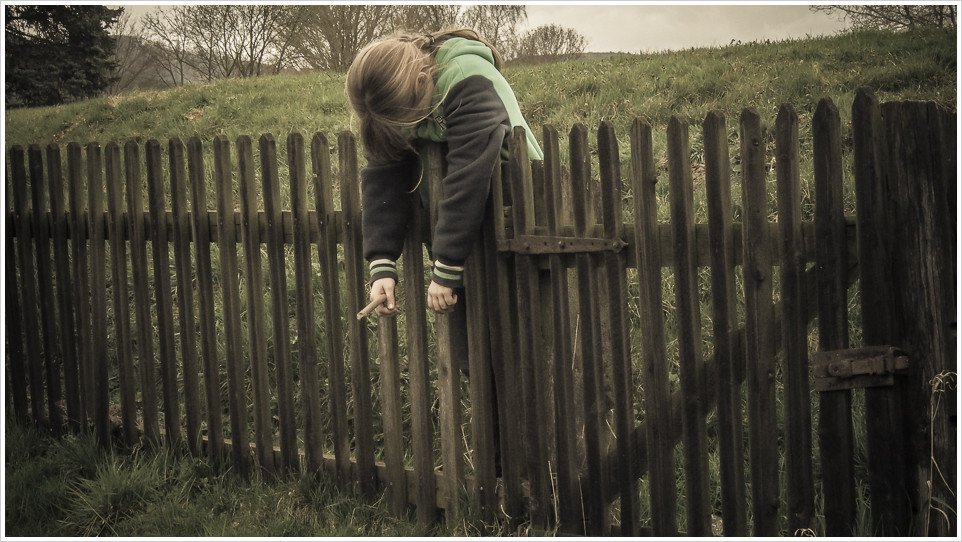 Wir waren heute zum fünfzigsten Geburtstag vom Bruder meiner Frau eingeladen, keine Ahnung was der so zu mir ist, aber egal, und nach der obligatorischen Kaffeetafel, drehten wir mit Kind und Enkelkindern eine Runde um den Dorfanger. Die evangelische Kirche, in der wir uns übrigens 1977 das Ja-Wort gaben, hatten wir dabei immer im Blick. Schön auf einer Kuppe mitten im Ort gelegen, ist sie das dominante Bauwerk. Hier gibt es ihn auch noch, den klassischen Zaun aus einzelnen Holzlatten, ein Relikt meiner Kindheit. Eigentlich ist es ja gemein und überheblich ist sicher noch dazu, aber ich konnte an diesem Motiv einfach nicht vorbeigehen. Denise wusste auch sofort was ich von ihr wollte und ergänzte das Bild, so dass der in Gedanken entstandene Spruch über die „Provinz“ bildlich umgesetzt werden konnte.