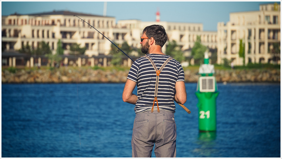 Beim letzten Besuch ist mir ein neues Exemplar untergekommen: Knöchelhose, Hosenträger, Vollbart, rosa Brille. In Berlin ganz klar als Hipster zu identifizieren, in Warnemünde eher eine seltenere Spezies. Aber vielleicht ist die Gentrifizierung inzwischen sogar bei den bodenständigen Anglern angekommen, kann ja sein. Angeln als so spießige Betätigung, dass es schon wieder hipp ist.