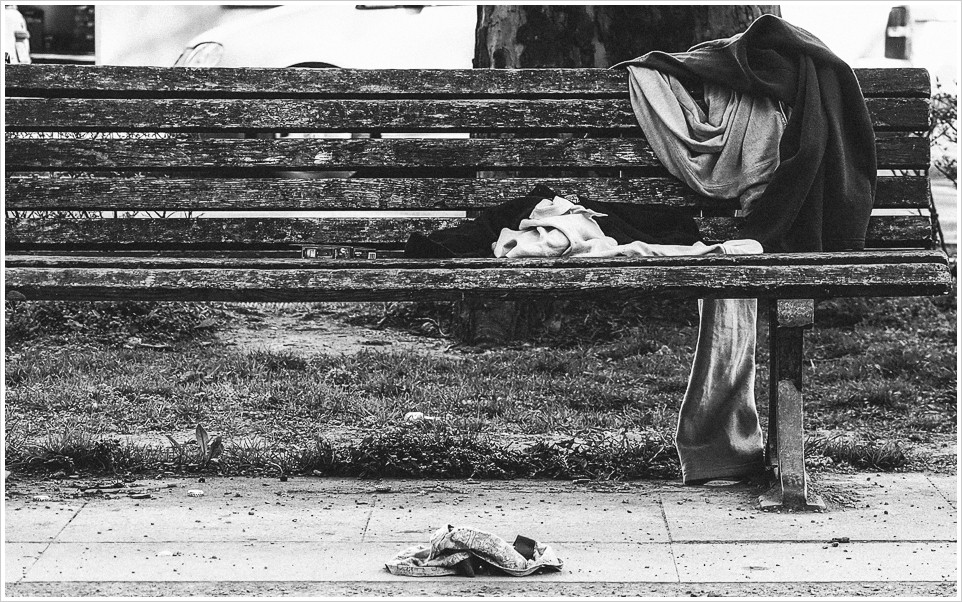 Ich hatte ja letztens bereits eine der Bänke auf dem Mittelstreifen der Warschauer Straße fotografiert, allerdings lagen dort seinerzeit nur noch die Anziehsachen des Bankbenutzers. Von ihm selber fehlte jede Spur.