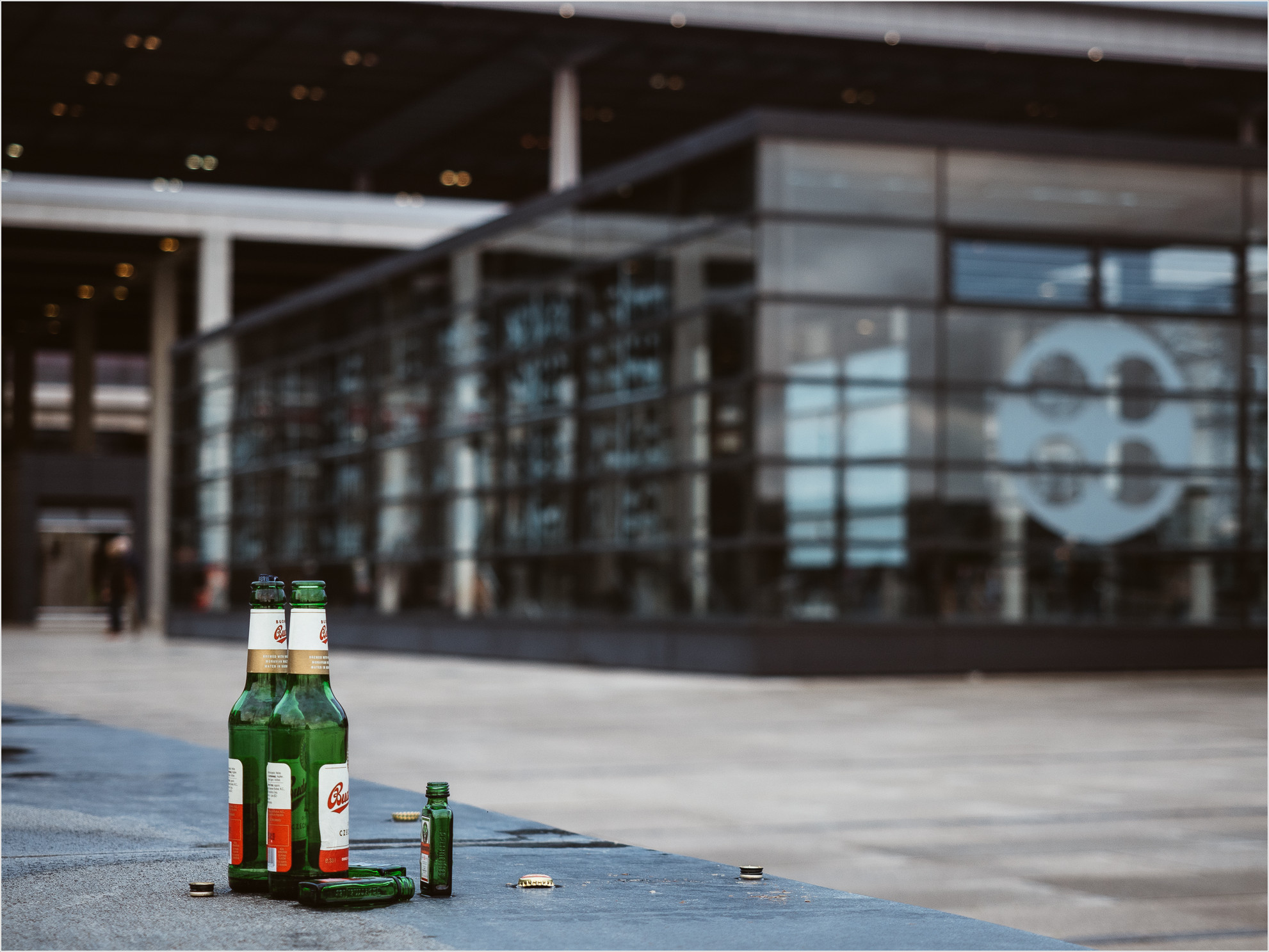 Für Planespotter ist das aktuell ja eher frustierend. Die Start- und Landefrequenzen der am Schönefelder Flughafen stationierten Airlines sind zur Mittagszeit eher spärlich zu nennen. Sind eben auch überwiegend nur Ferienflieger, die Airlines der Lufthansa, Air Berlin und wie sie alle heissen, fliegen halt auf Tegel. Nach fünfzehn Minuten auf dem windigen Turm haben wir uns wieder vom Acker gemacht. Noch einen kurzen Fotostopp vor dem Haupteingang eingelegt, wo sich Skater und Fotografen die große Leere teilen, das sollte reichen für die nächsten 1000 Tage. Ein Rudel streunende Wölfe oder vorbeirollende Steppenläufer hätten uns jetzt auch nicht wirklich gewundert. Faszinierend.