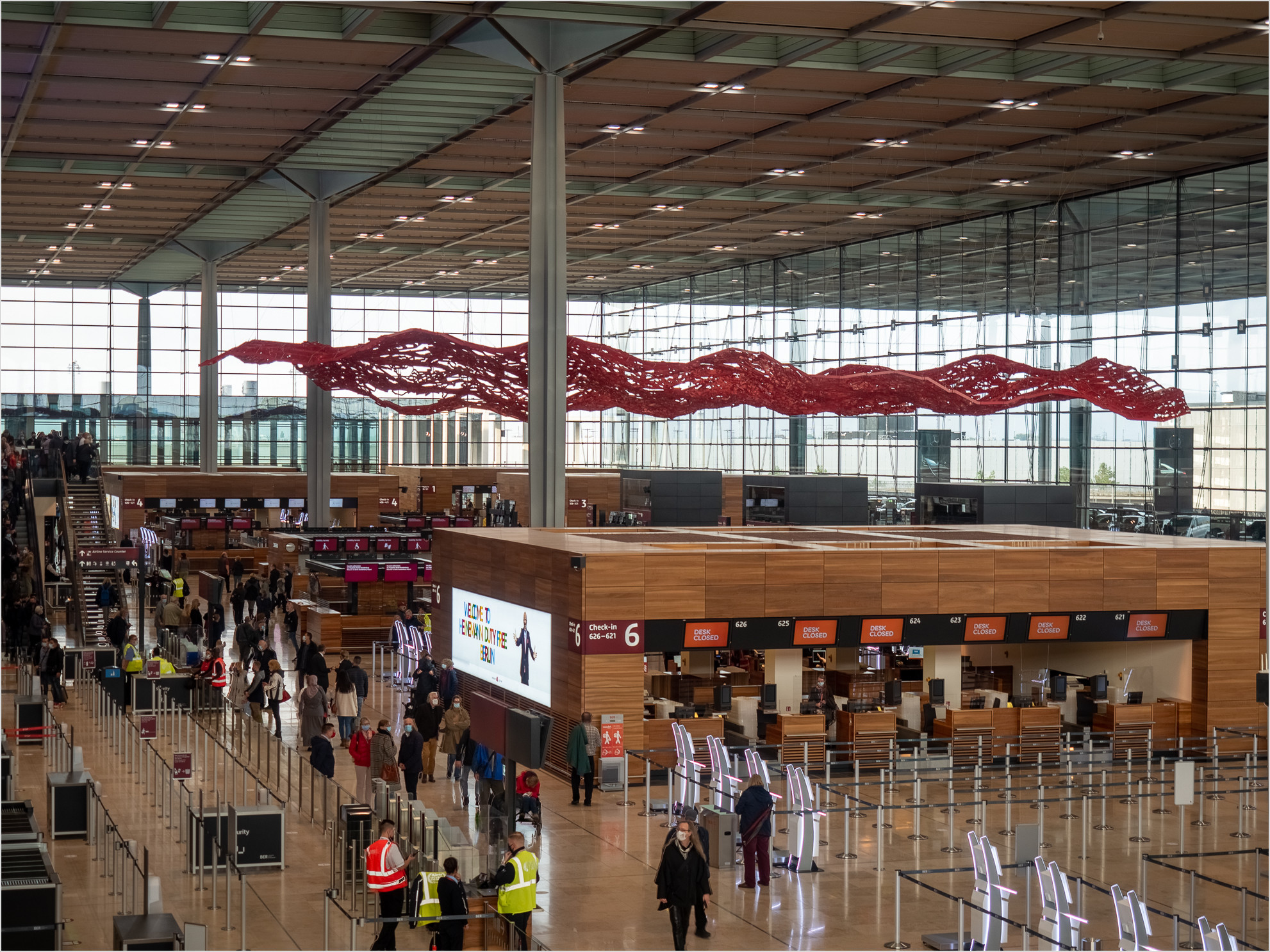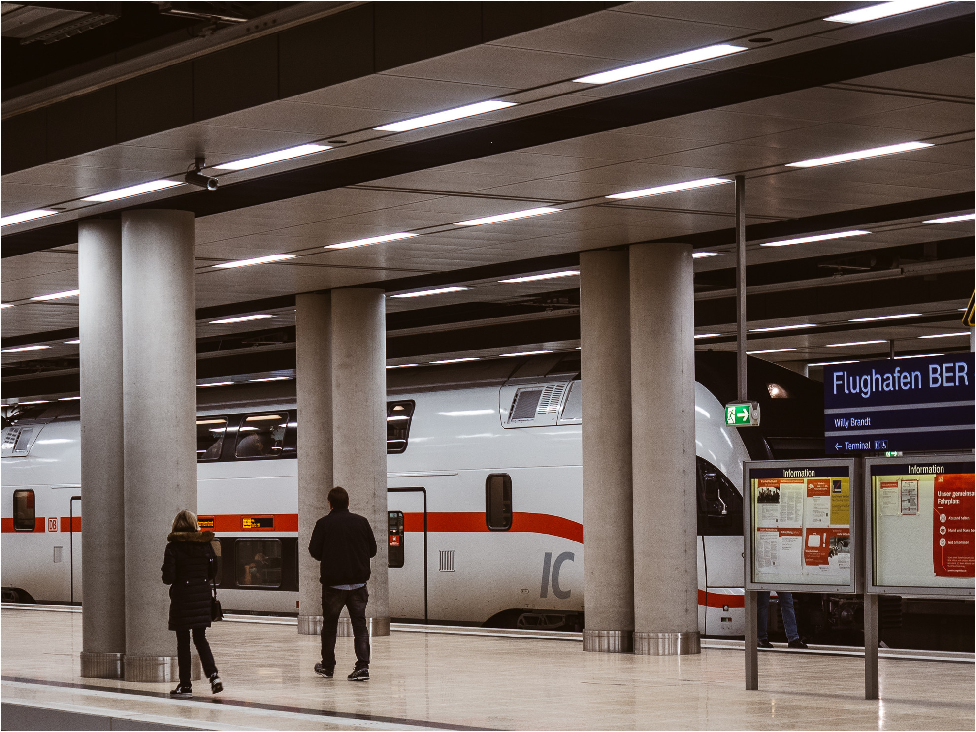Mit mir sind eine Menge Leute unterwegs, alle mit Maske im Gesicht, sehr vorbildlich. Was allerdings fehlt: Passagiere. Keine Koffer, keine Aufregung, nur Touristen, die sich am Sonntag mal den neuen Flughafen ansehen wollen. So wie icke. Wie es sich heutzutage gehört, ist der der BER hervorragend an den ÖPNV angebunden und vom Tiefbahnsteig kommend stehe ich ein paar Minuten später mitten unter dem „Magic Carpet“ im T 1.