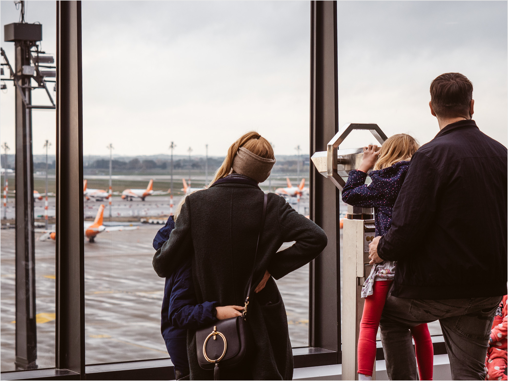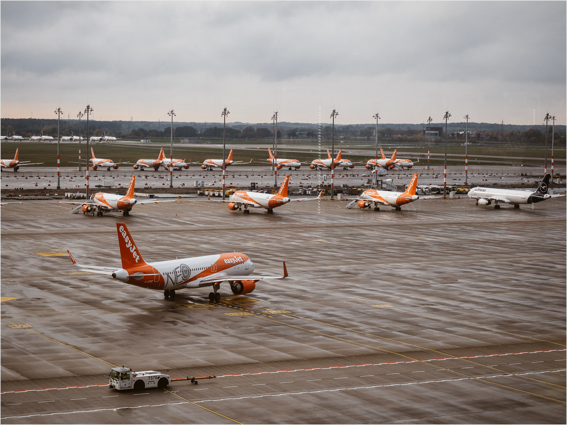 Auch hier kaum Passagiere, allerdings fliegen an diesem Sonntag auch nur eine Handvoll Maschinen ab. Mit meinem vorab gebuchten Onlineticket für die Besucherterrasse lasse ich die lange Schlange der auf ein Ticket wartenden links liegen und stehe kurz danach im Freien mit Blick auf die orangen Maschinen der EasyJet Flugzeuge die das Vorfeld farblich dominieren. Weit hinten hat die Lufthansa ihre Maschinen geparkt, die aktuell wegen Corona nicht gebraucht werden.