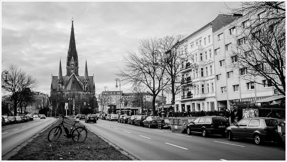 Der große Kurfürst ging hier im 17. Jahrhundert auf die Jagd nach Hasen und die deutsche Turnbewegung nahm in diesem Park zu Anfang des 20. Jahrhunderts mit Turnvater Jahn ihren Anfang. Am nördlichen Eingang des Parks erinnert ein Jahndenkmal daran. Die Rede ist natürlich von der Hasenheide, die sich – vom Hermannplatz kommend – bis zum Südstern zieht und der wir im achten Teil der „Grenz(er)fahrung folgen. Die Kirche am Südstern dominiert das Ende der Sichtachse entlang der Hasenheide und kündigt einen erneuten Schwenk der Grenze in Richtung Tempelhof an. Dieses Teilstück der Kreuzberger Grenze ist auch nicht soooo spannend und für geübte Radfahrer in 5 Minuten zu bewältigen. Ein paar Bilder gibt es natürlich trotzdem.