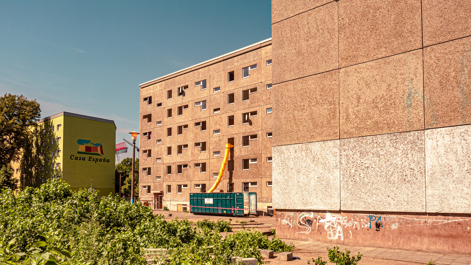 An den leeren Fensterhöhlen zeigen verbliebene Satellitenschüsseln in die alte Heimat, nach Rumänien. Aus einem kleinen Dorf in der Nähe von Bukarest, zogen 2015 rund 350 Rom:nja in den damals leerstehenden Plattenbau aus DDR Zeiten und bildeten dort eine Art Gemeinschaft. Inzwischen sind Bauarbeiter damit beschäftigt das Haus für den Abriss leerzuräumen und kippen den Schutt durch ein gelbes Rohr in einen Container im Innenhof.