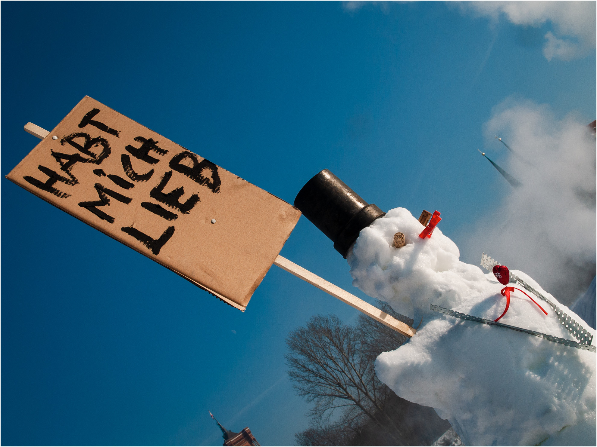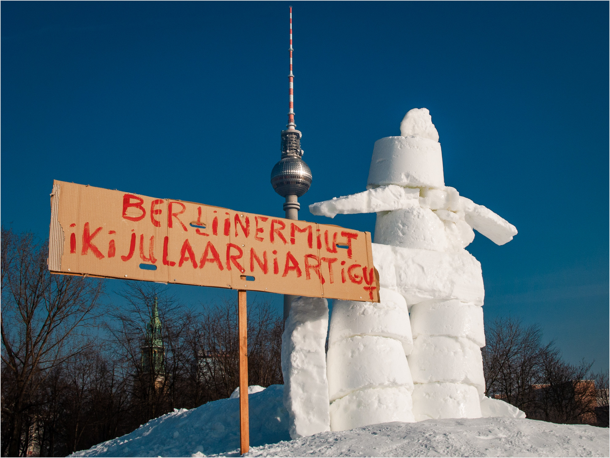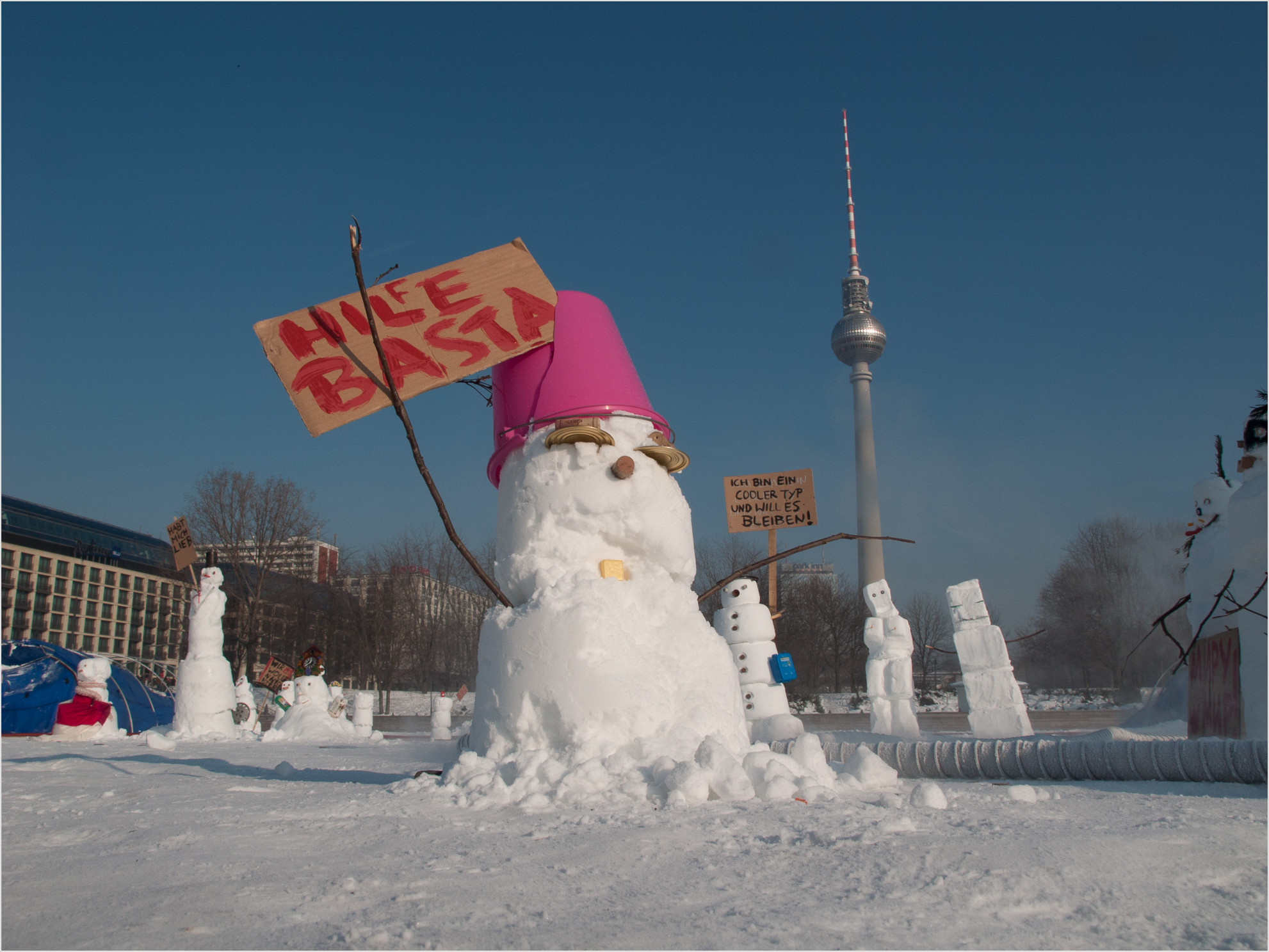 Im Winter 2010 fand auf der grünen Wiese des Schlossplatzes ein Happening statt. Ende Januar demonstrierten hier hunderte von Schneemännern bei -10° C zur Freude der Berlinerinnen und Berliner auf dem Schlossplatz in Berlin für mehr Engagement gegen die Klimaerwärmung. Von dieser war allerdings in diesem Winter kaum etwas zu spüren, sollte er doch als einer der längsten und schneereichsten in die Annalen von Berlin eingehen. Selbst die Kinder hatten irgendwann genug von dem weißen Zeugs und der Rodelberg im Friedrichshainer Volkspark verlor an Attraktivität. In dem Jahr konnte man sogar Eishockey auf dem Weissensee spielen. Ein echt verrückter Winter mit coolen Schneemänner und – frauen als temporäre Platzhalter für das Stadtschloss.